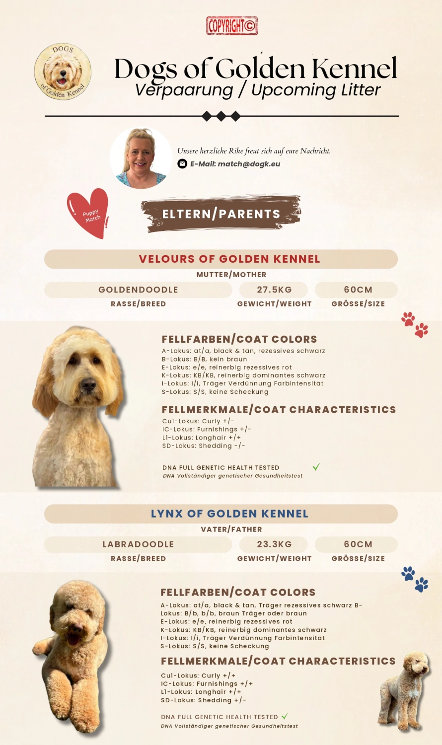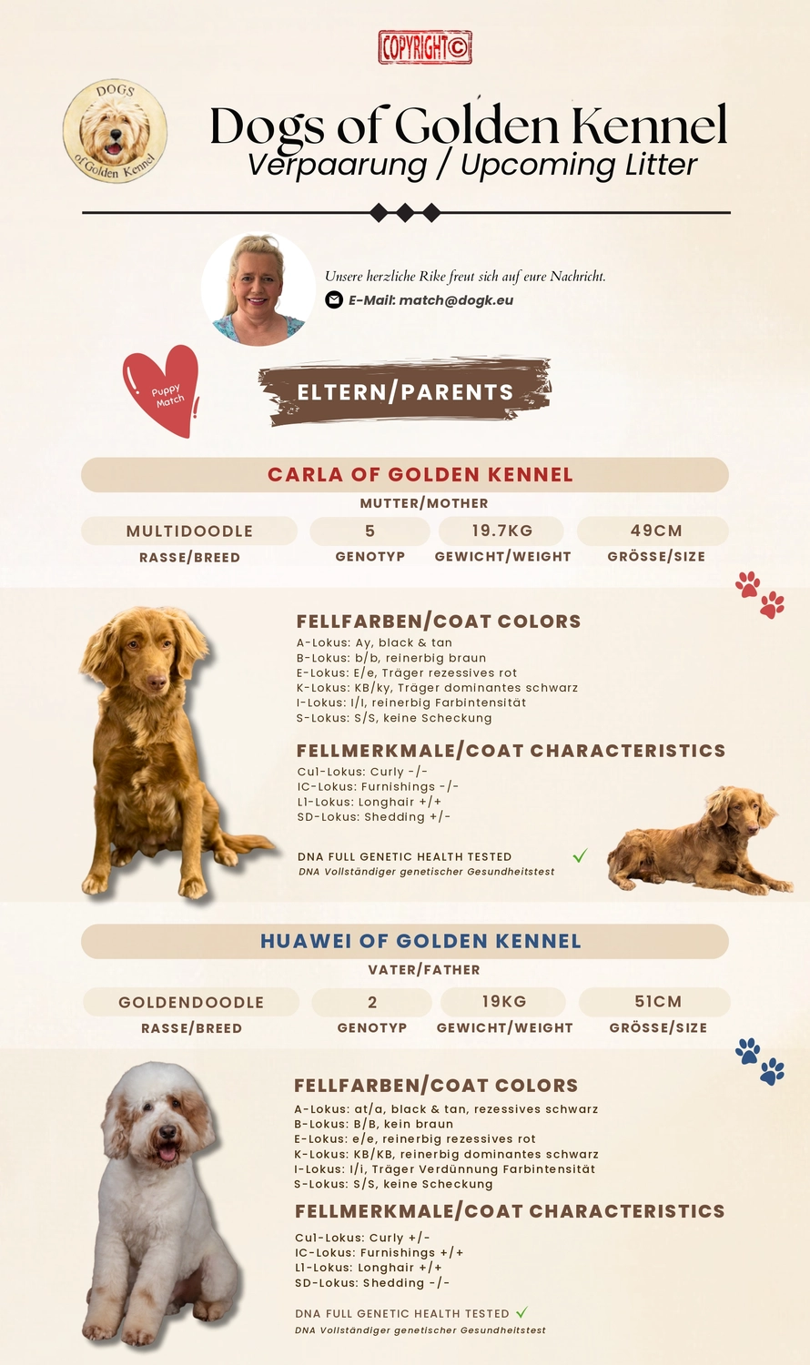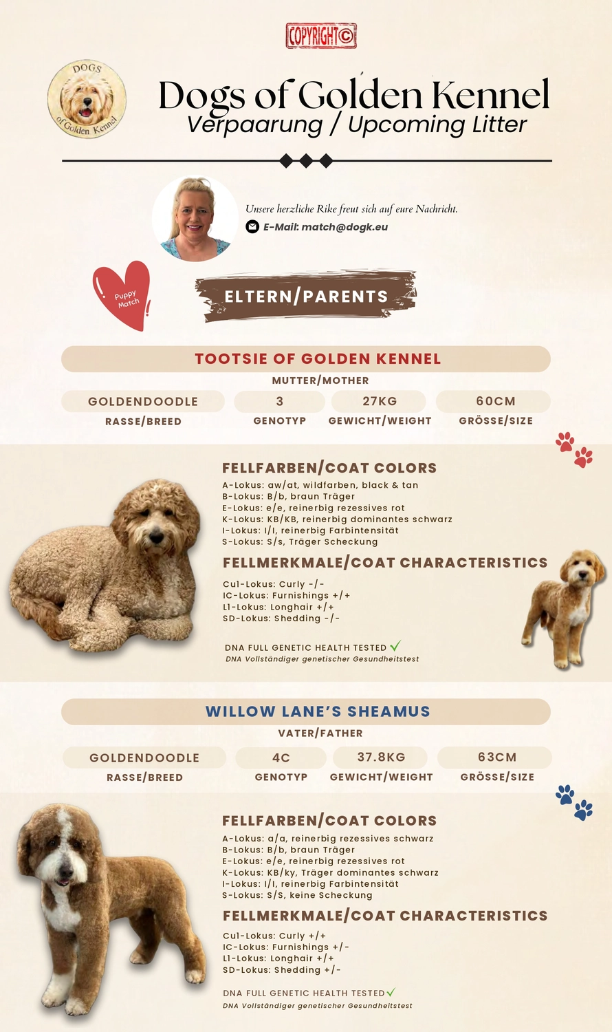 Hier bekommen Sie einen kleinen Überblick über aktuelle und mögliche zukünftige Würfe. Sie haben hier die Möglichkeit sich unverbindlich für einen Wurf auf die Interessentenliste schreiben zu lassen. Wir weisen aber auch darauf hin, dass dies auch für uns unverbindlich ist.