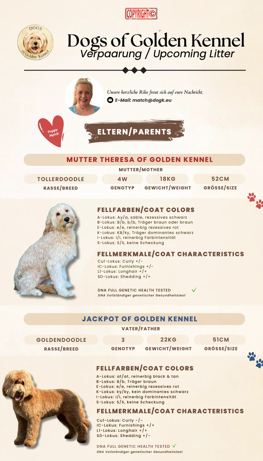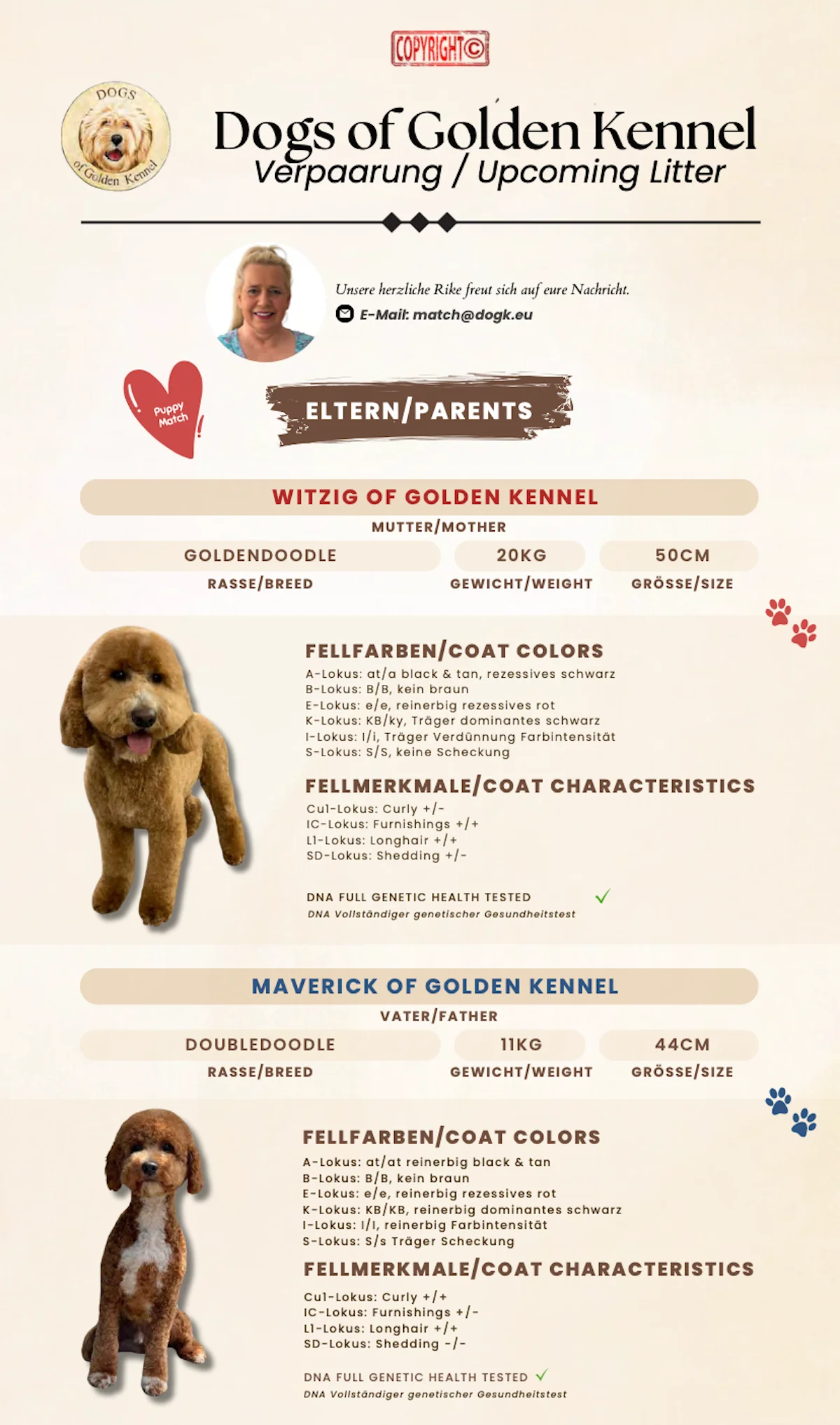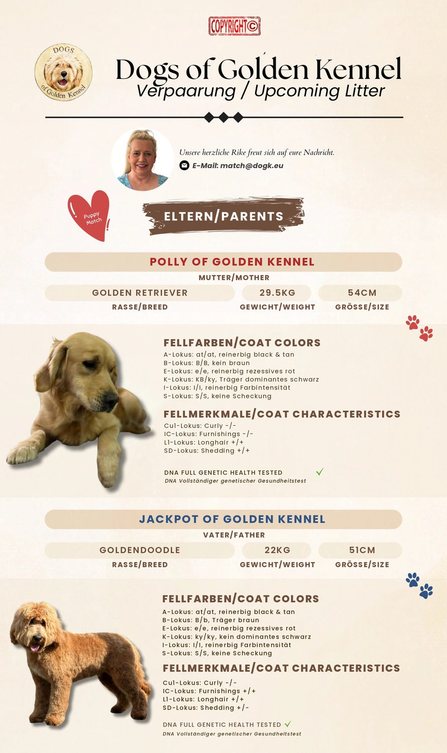 Hier bekommen Sie einen kleinen Überblick über aktuelle und mögliche zukünftige Würfe. Sie haben hier die Möglichkeit sich unverbindlich für einen Wurf auf die Interessentenliste schreiben zu lassen. Wir weisen aber auch darauf hin, dass dies auch für uns unverbindlich ist.